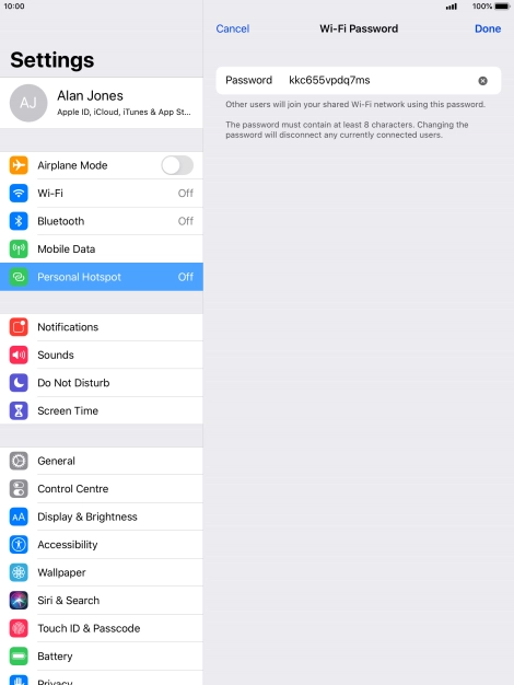 2 Key in the password for personal hotspot