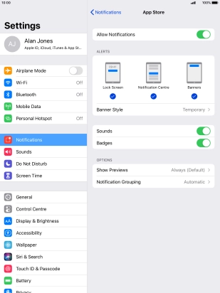 Press the indicator next to "Allow Notifications" to turn notifications for the selected application on or off.