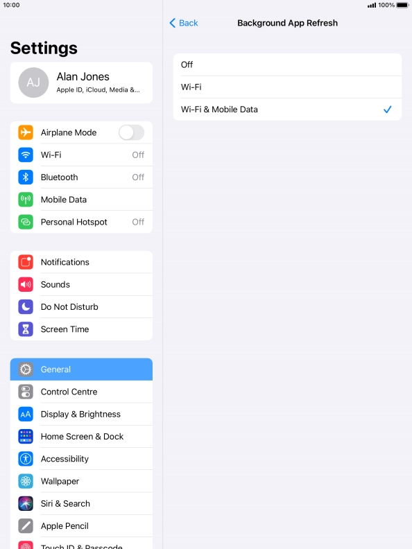 To turn off background refresh of apps, press Off.