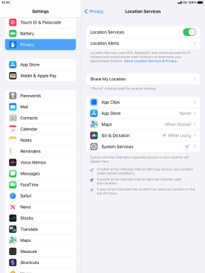 Press the indicator next to "Location Services" to turn the function on or off.