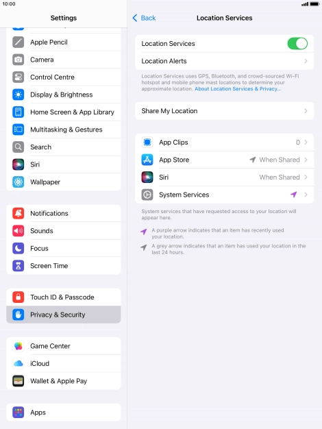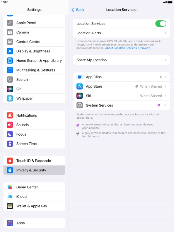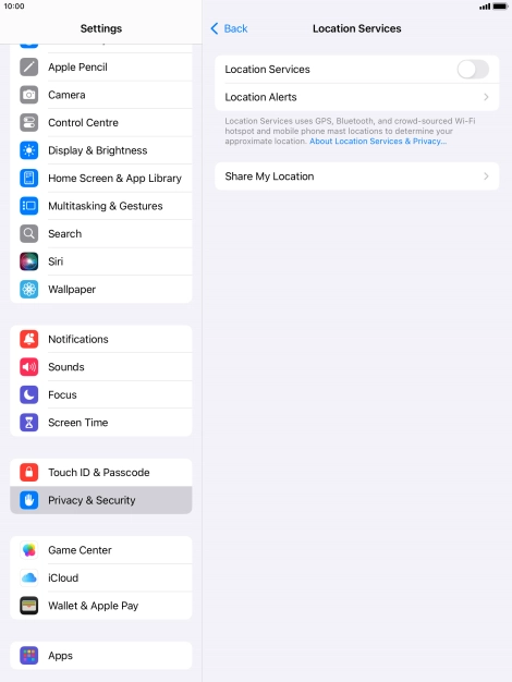 Press the indicator next to "Location Services" to turn the function on or off.