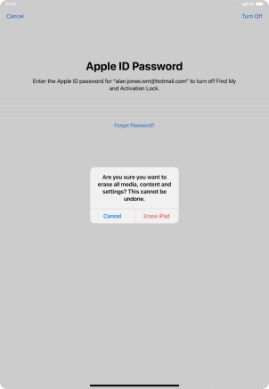 Key in the password for your Apple ID and press Erase iPad. Wait a moment while the factory default settings are restored. Follow the instructions on the screen to set up your tablet and prepare it for use.