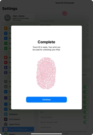 You can set your tablet to use your fingerprint as lock code or to authorise iTunes and App Store purchases. To use Touch ID, you need to turn on the lock code.
