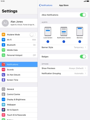 Press the indicator next to "Allow Notifications" to turn notifications for the selected application on or off.