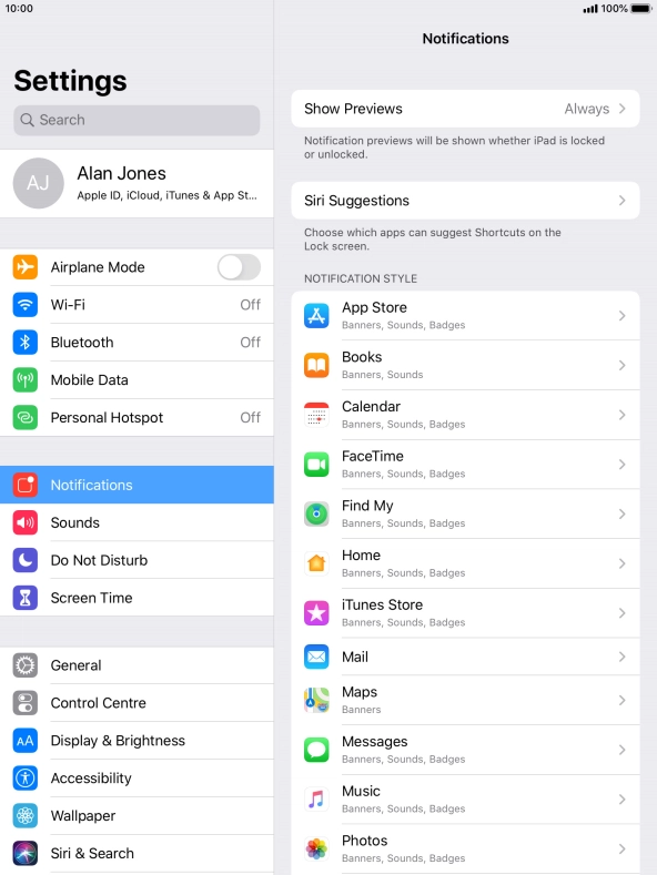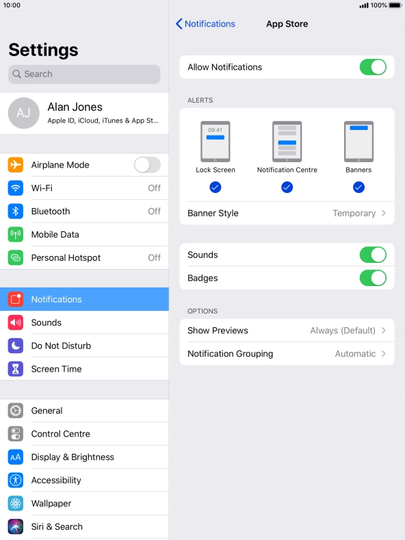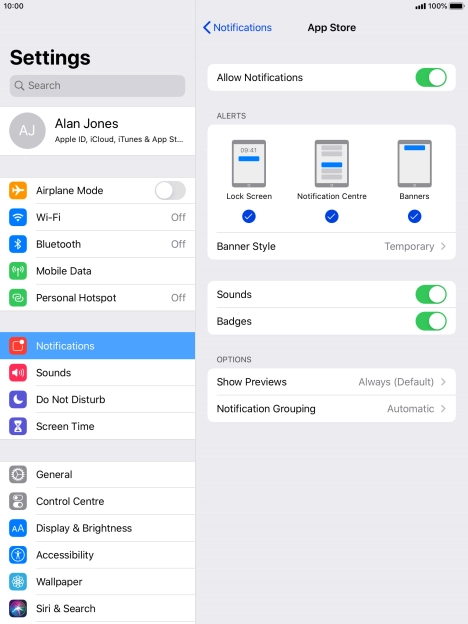 Press the indicator next to "Allow Notifications" to turn notifications for the selected application on or off.