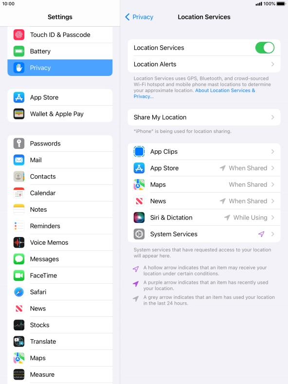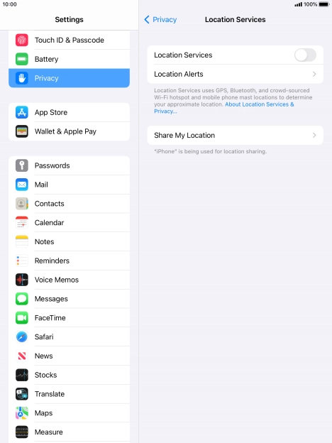 Press the indicator next to "Location Services" to turn the function on or off.