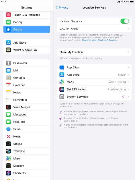 Press the indicator next to "Location Services" to turn the function on or off.