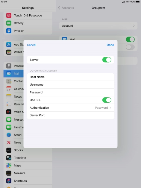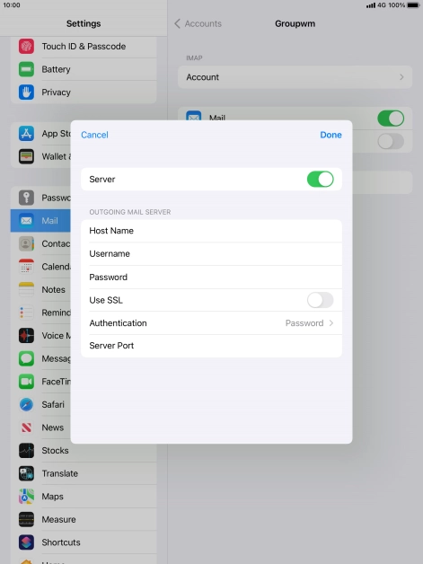 Press Password and key in the password for your email account. Please note that if you're using Vodafone's outgoing server, leave the password field empty.
