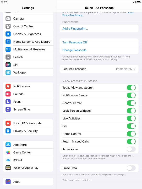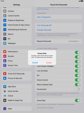 Press the indicator next to "Erase Data" to turn the function on or off.