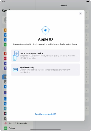 If you don t have an Apple ID, press Forgot password or don't have an Apple ID? and follow the instructions on the screen to create an Apple ID.