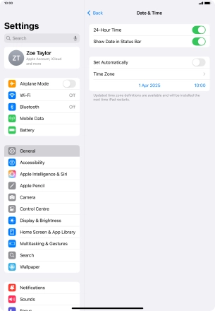 2. Turn on automatic update of time zone, time and date.