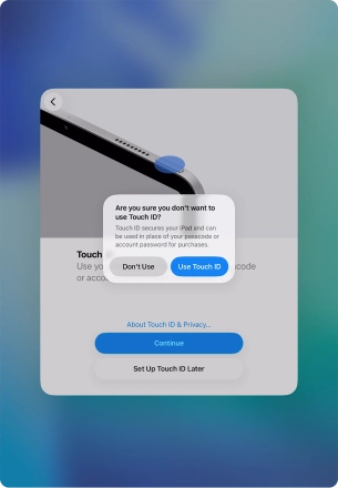 Follow the instructions on the screen to turn on use of Touch ID or press Set Up Touch ID Later.