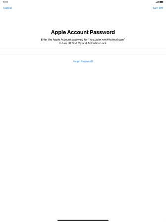 Key in the password for your Apple ID and press Turn Off. Wait a moment while the factory default settings are restored. Follow the instructions on the screen to set up your tablet and prepare it for use.