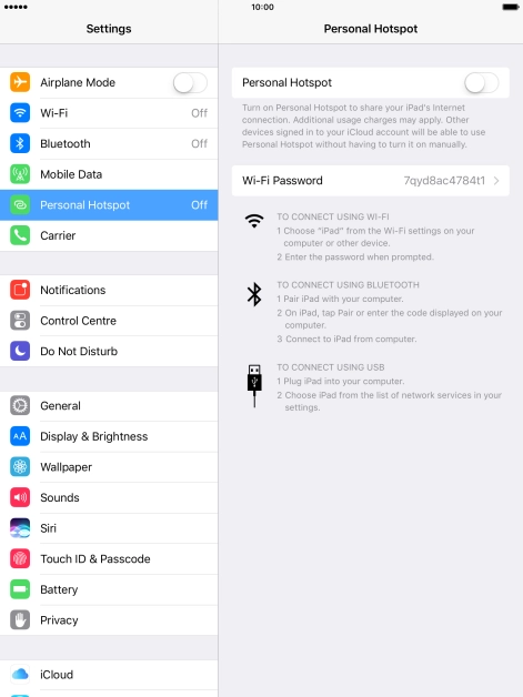 Press the indicator next to "Personal Hotspot" to turn on the function.