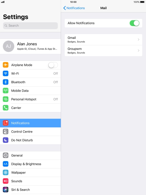 Press the indicator next to "Allow Notifications" to turn notifications for the selected application on or off.