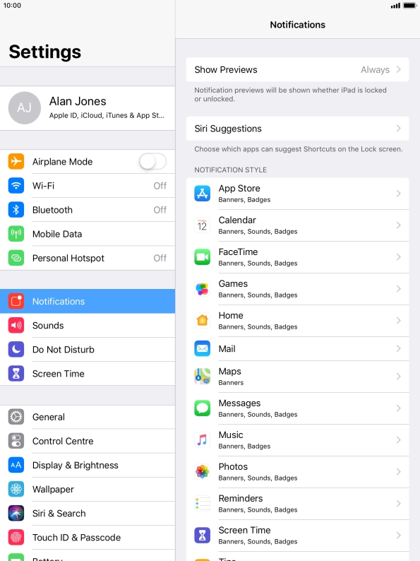 Press the indicator next to "Allow Notifications" to turn notifications for the selected application on or off.