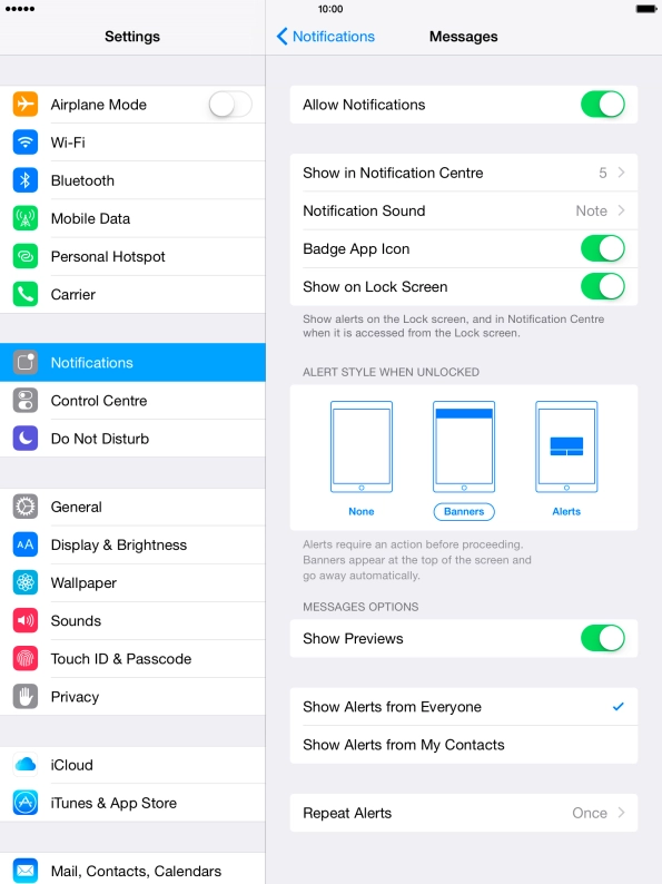 Press the required setting to select the number of messages to be displayed in Notification Centre.