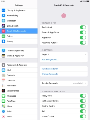 You can set your tablet to use your fingerprint as lock code or to authorise iTunes and App Store purchases. To use Touch ID, you need to turn on the lock code.