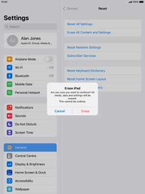 Key in the password for your Apple ID and press Erase. Wait a moment while the factory default settings are restored. Follow the instructions on the screen to set up your tablet and prepare it for use.