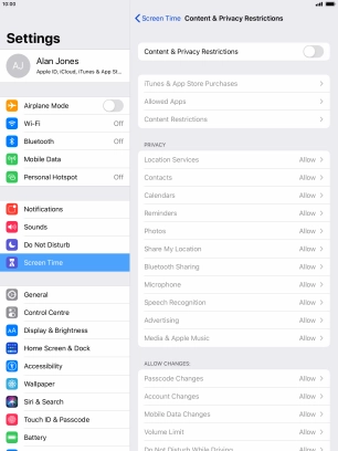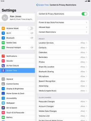 Press the indicator next to "Content & Privacy Restrictions" and follow the instructions on the screen to select settings for content and privacy restrictions.