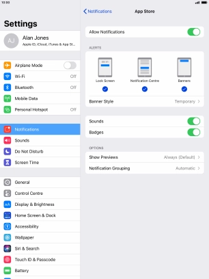 Press the indicator next to "Allow Notifications" to turn notifications for the selected application on or off.