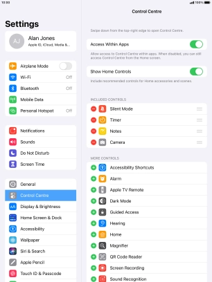 Select settings for Control Centre on your Apple iPad Air (2019) iPadOS 14.0