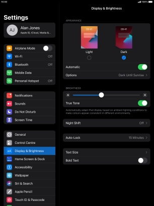 If you turn on the function, press Options and follow the instructions on the screen to select the required period of time for Dark Mode.