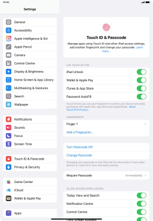 You can set your tablet to use your fingerprint as lock code or to authorise iTunes and App Store purchases. To use Touch ID, you need to turn on the lock code.