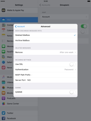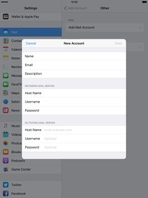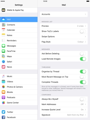 Press the required email account and follow the instructions on the screen to select settings for the specific account.