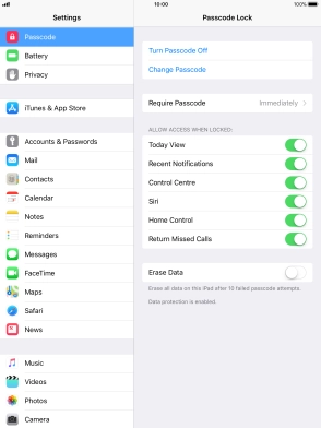 Turn use of lock code on your Apple iPad Air iOS 11.0 on or off