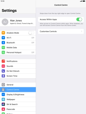 Select settings for Control Centre on your Apple iPad Air iOS 12.0