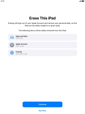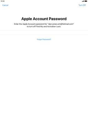 Key in the password for your Apple ID and press Turn Off. Wait a moment while the factory default settings are restored. Follow the instructions on the screen to set up your tablet and prepare it for use.