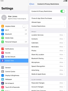 Press the indicator next to "Content & Privacy Restrictions" and follow the instructions on the screen to select settings for content and privacy restrictions.