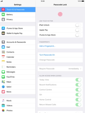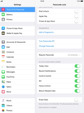 Turn use of lock code on your Apple iPad mini 4 iOS 11.0 on or off