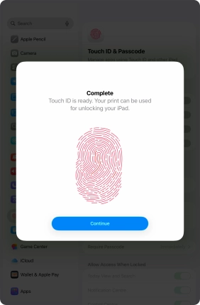 You can set your tablet to use your fingerprint as lock code or to authorise iTunes and App Store purchases. To use Touch ID, you need to turn on the lock code.