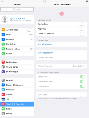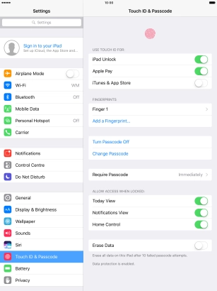 You can set your tablet to use your fingerprint as lock code or to authorise iTunes and App Store purchases. To use Touch ID, you need to turn on the lock code.