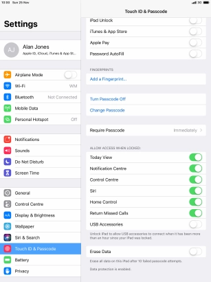 Turn use of lock code on your Apple iPad Pro 10.5 iOS 12.0 on or off