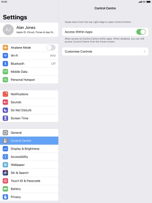Select settings for Control Centre on your Apple iPad Pro 10.5 iPadOS 13.1