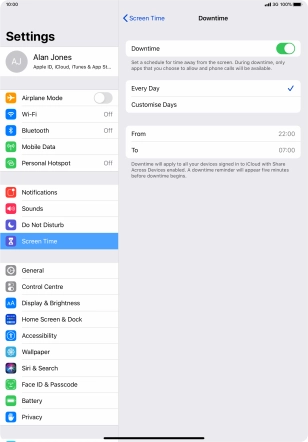 Press the indicator next to "Downtime" and follow the instructions on the screen to select Downtime period.
