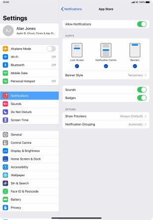 Press the indicator next to "Allow Notifications" to turn notifications for the selected application on or off.