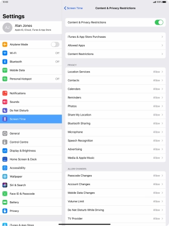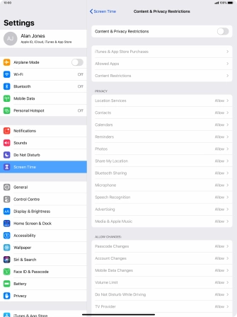 Press the indicator next to "Content & Privacy Restrictions" and follow the instructions on the screen to select settings for content and privacy restrictions.