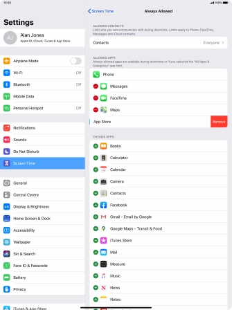 Press the remove icon next to the required app to remove it from the list of allowed apps during Downtime.