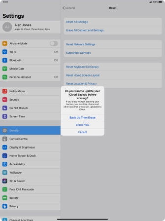 Key in the password for your Apple ID and press Erase. Wait a moment while the factory default settings are restored. Follow the instructions on the screen to set up your tablet and prepare it for use.