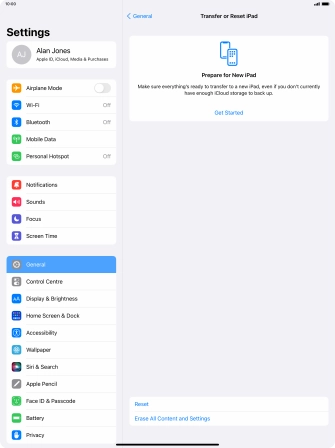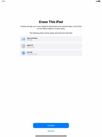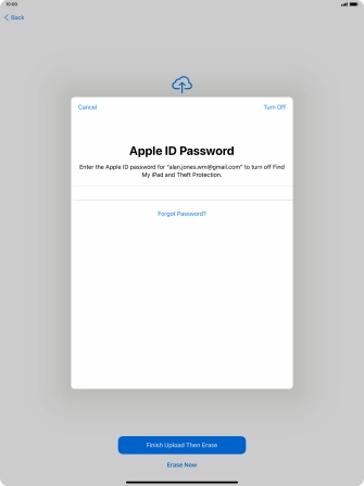 Key in the password for your Apple ID and press Turn Off. Wait a moment while the factory default settings are restored. Follow the instructions on the screen to set up your tablet and prepare it for use.