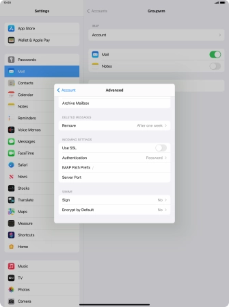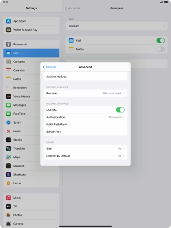 Press the required email account and follow the instructions on the screen to select settings for the specific account.