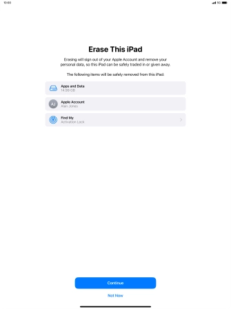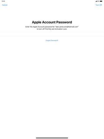 Key in the password for your Apple ID and press Turn Off. Wait a moment while the factory default settings are restored. Follow the instructions on the screen to set up your tablet and prepare it for use.