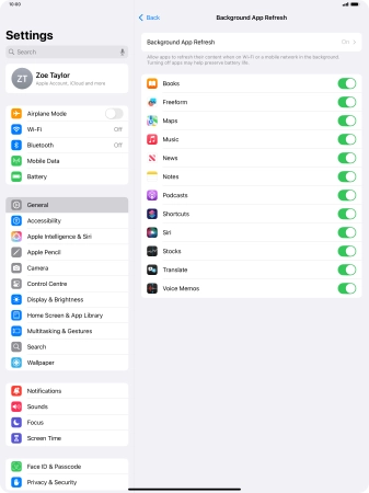 Select settings for background refresh of apps on your Apple iPad Pro 13-inch (M4) iPadOS 18