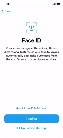Follow the instructions on the screen to turn on use of Face ID or press Set Up Later in Settings.