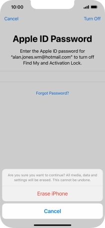 Key in the password for your Apple ID and press Erase iPhone. Wait a moment while the factory default settings are restored. Follow the instructions on the screen to set up your phone and prepare it for use.