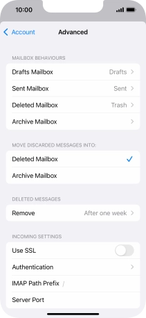Press the required email account and follow the instructions on the screen to select settings for the specific account.